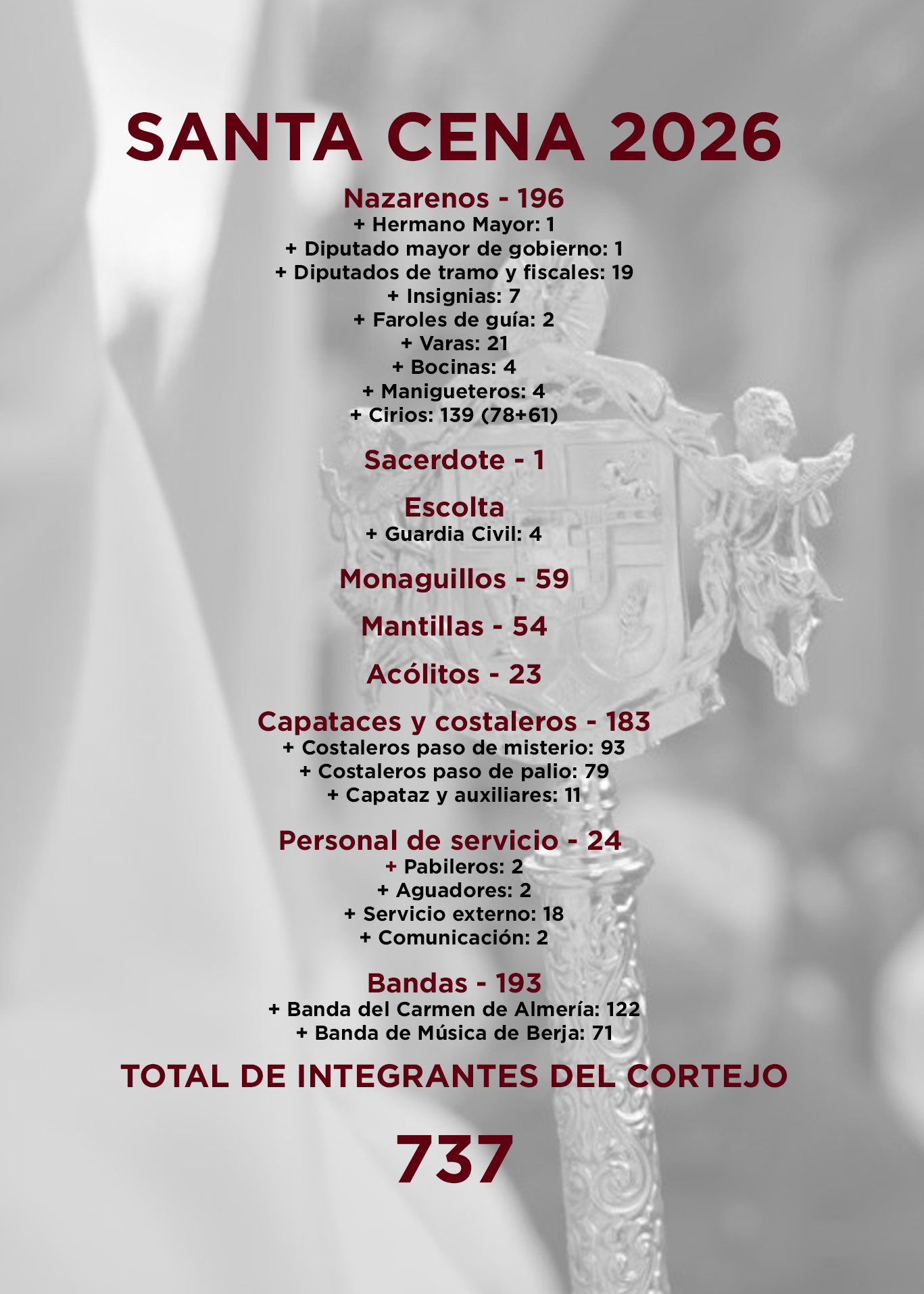 En total, y teniendo en cuenta nuestras bandas, el personal auxiliar exterior o la escolta de la Guardia Civil, 737 personas formaron parte de la Cofradía de la Santa Cena y María Santísima de Fe y Caridad el pasado Domingo de Ramos de 2026, siendo un año más la cifra más alta de nuestra historia y superando, por segunda vez consecutiva, el número de 700.